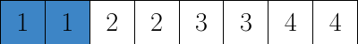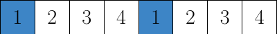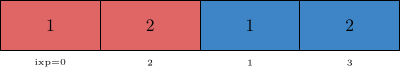 Here, every block is identified by an index, in the code often called ixp. The mapping of the index to the block is persistent but arbitrary and therefore subject to convention. In memory, and correspondingly at site index level, the blocks are stored such that first there is a large block of field data of local lattices with even parity and then with odd parity. However, at block index level, the even ixp identify even lattices and odd ixp odd lattices, with lattices of two parities belonging to the same local lattices adjacent. This means for example, that if the even part of my local lattice is stored at ixp=4, then the odd part can be found at ixp=5. For a simple decomposition into two blocks with even-odd preconditioning are arranged in memory as in the following illustration
