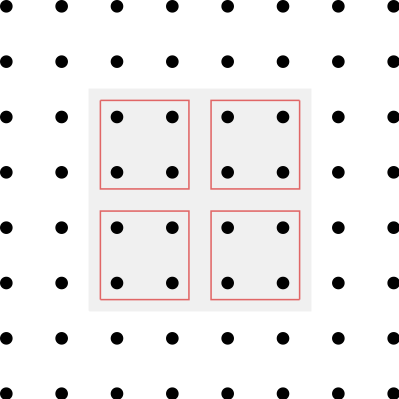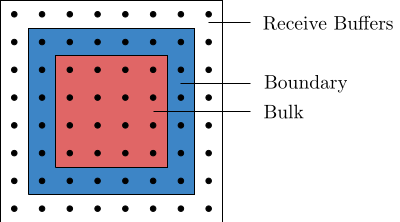 Here in particular the arrangement of the boundary elements is crucial, because different overlapping parts of the boundary are requested by different nodes. At this point, we do not need to worry about the concrete arrangement of points in the bulk, because computations on the inner points can be executed in a single block, a caveat being discussed in the next section.